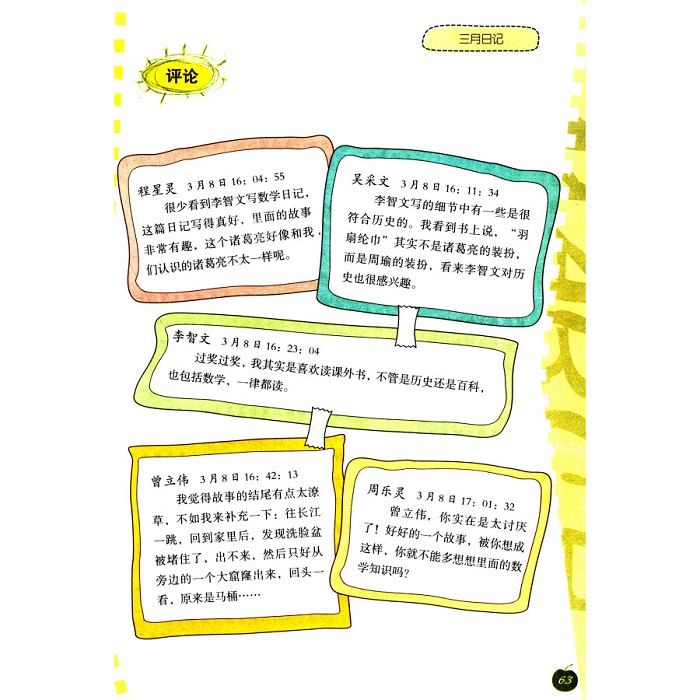 每篇故事都以班上某位学生为“作者”“他们”都从自己的角度讲述了学数学的故事,而每篇故事后面的互动评论,更增添了真实感、亲近感,仿佛这些故事就是在读者自己班上发生的。