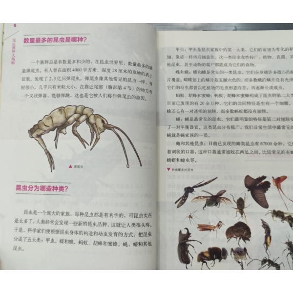 全书共七部分,*部分走进昆虫世界,主要讲述了昆虫是什么时候出现的、昆虫的身体分几部分、各种昆虫都各自具有哪些特长等关于昆虫的基础知识;第二部分甲虫家族,第三部分蝶和蛾家族,第四部分蚂蚁、胡峰、蜜蜂家族,第五部分蝇家族,第六部分蝽和其他昆虫家族,分别介绍了甲虫家族,蝶和蛾家族,蚂蚁、胡峰、蜜蜂家族,蝽和其他昆虫家族的主要成员、形态特征、捕食习惯、居住特点、繁殖情况等。