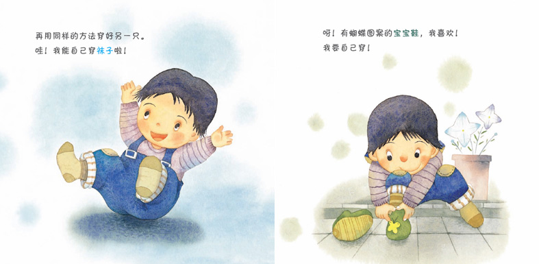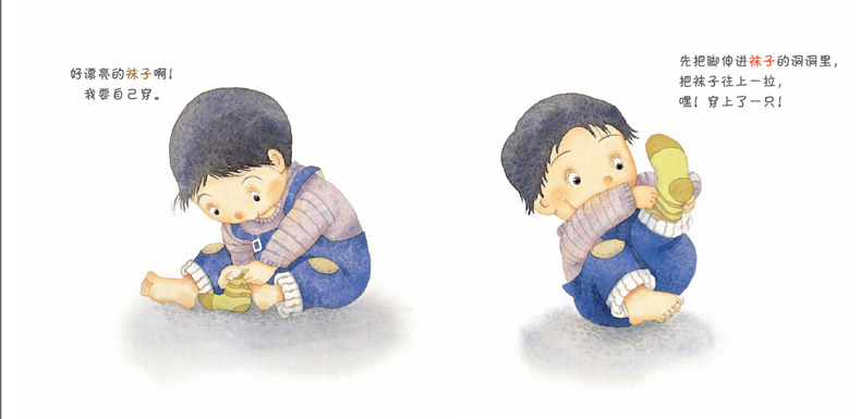 我会自己穿鞋啦!为了跟着妈妈出门儿,宝宝自己穿起了袜子。袜子很快就穿好了,宝宝巨额东鞋也由自己穿。鞋穿好了,可是,感觉怪怪的。问题在哪里呢?嗨!原来是把左右鞋穿反了。妈妈教宝宝如何先摆好鞋再穿。终于,宝宝也正确地穿上了鞋。
