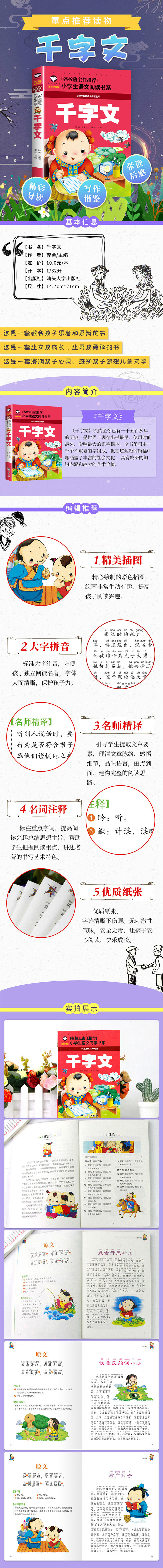 《千字文》是周兴嗣奉皇命从王羲之书法中选取一千个字,编纂而成的韵文,是一部优秀的启蒙读物。