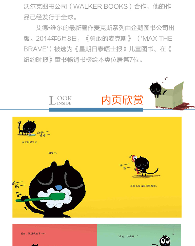 艾德·维尔编著的《麦克斯在黑夜(精)》是一本儿童绘本。这就是麦克斯。麦克斯早该上床睡觉了。他**困。麦克斯睡觉前,想要和月亮说“晚安”……但是,月亮在哪儿呢?麦克斯走出门,开始了寻找月亮的漫长旅程,经过千辛万苦麦克斯终于见到了月亮,这下麦克斯可以安心睡一觉了。
