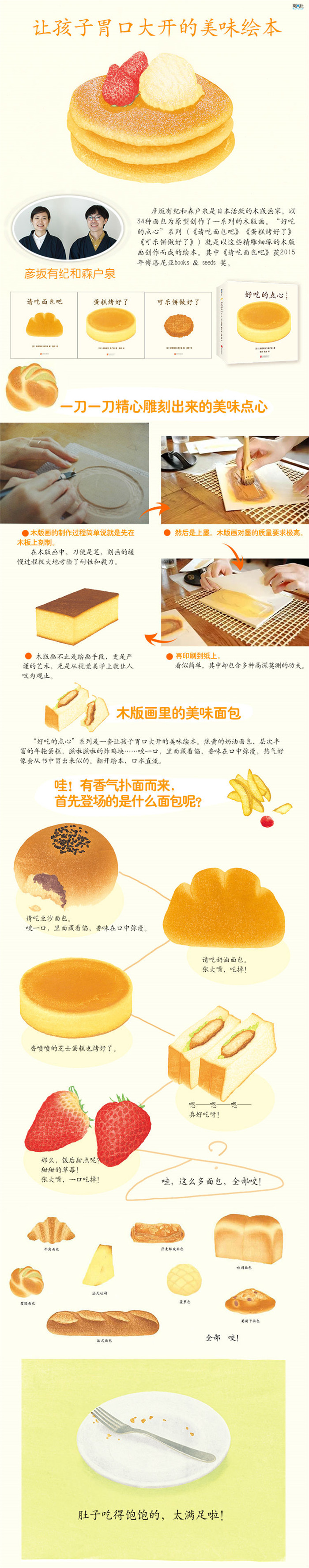 “好吃的点心”系列是彦坂有纪以34种面包为原型创作的木版画。用木板刻画面包的松软、热气腾腾,一刀一刀精心雕刻,传达出了图片的真实。