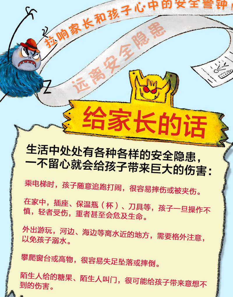 无论在家中,还是在户外,生活中处处有着各种各样的安全隐患。本书通过大胆新奇的想法,将安全隐患通过怪兽之口,以自我夸耀的方式讲述出来,使得孩子在哈哈大笑的同时,学会辨别危险、保护自己。该绘本用充满创意的故事告诫家长和孩子,要时刻警惕危险的发生,远离怪兽布下的陷阱,是一本难得的兼具教育意义和趣味性的佳作。