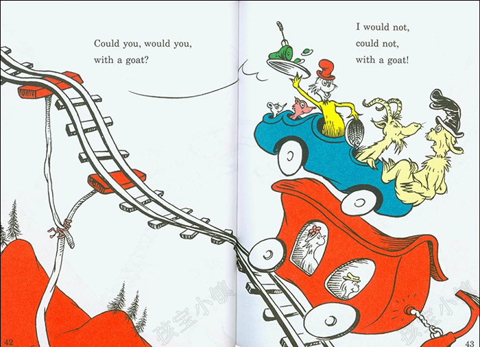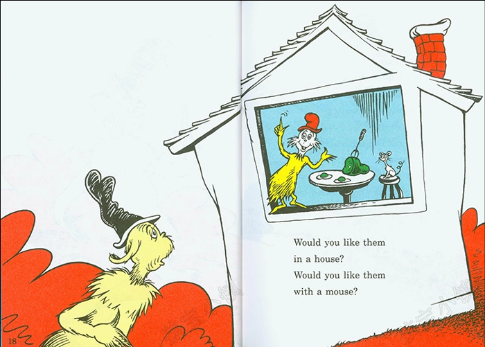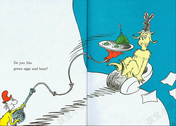 本书的创作源于苏斯博士和一位朋友打赌,能否用五十个单词写成一个故事。于是便有了这本脍炙人口的书。故事是容易引起孩子共鸣的熟悉话题要不要尝试新食物。故事情节发展激烈,一个拼命劝,一个玩命躲,最后的结局出人意料。苏斯博士的语言是节奏感很强的韵文,朗朗上口,书中所用词汇很少,而且句子结构大量重复,只置换少量单词,孩子一旦记住了第一句,后边的句子很容易读出来,让孩子颇有成就感。