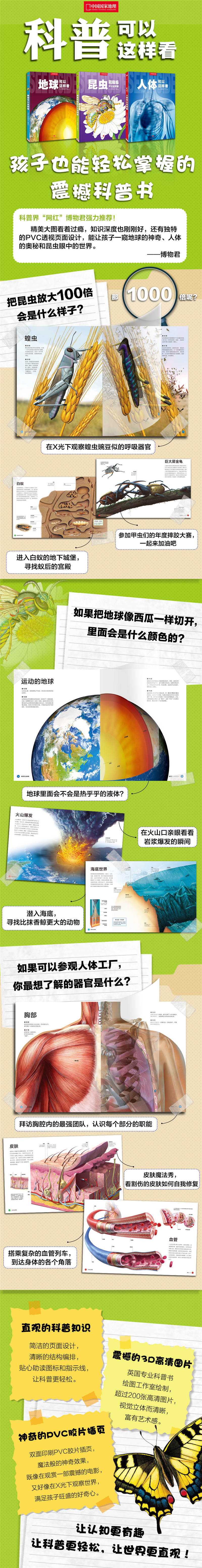 “博物君”审稿并推荐给孩子们:“精美大图看着过瘾,知识深度也刚刚好,还有独特的PVC透视页面设计,能让孩子一窥地球的神奇、人体的奥秘和昆虫眼中的世界。”