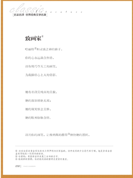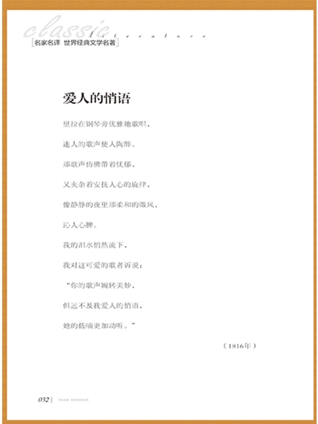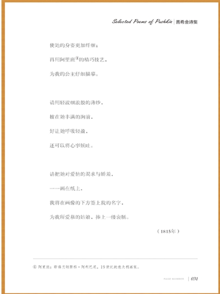 本书是“俄国文学之父”、“俄国诗歌的太阳”普希金的代表之作,其中收录有《致大海》《假如生活欺骗了你》《“我爱过您”》《夜莺与玫瑰》等被举世公认的普希金经典抒情短诗。翻译者充分把握住了普希金诗歌的特点,其诗句清新流畅,热烈深沉,有丰富的人情味和哲理意味,让人从中感受到诗人真诚博大的情怀和坚强乐观的思想。亚历山大·谢尔盖耶维奇·普希金,是伟大的俄罗斯民族诗人,俄罗斯近代文学的奠基者和俄罗斯语言的创建者。从1813年他创作诗歌到1837年,在他不太长的诗歌创作生涯中,他除了创作数十部长诗和童话诗外,还创作了近800首抒情诗。抒情诗的写作贯穿了普希金的整个创作生涯,这也是诗人文学遗产中珍贵的作品。他的抒情诗题材广泛、形式多样,友谊、爱情、政治、历史、自然景物、乡村、文学以及神话传说等主题在他的诗中都有所反映。