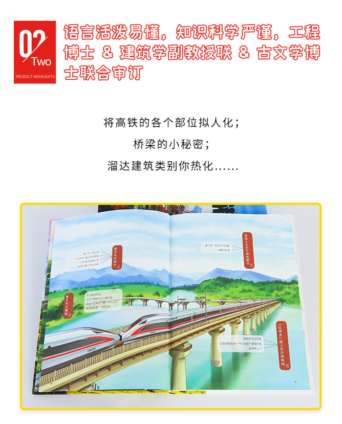 运营时速能达350公里的复兴号家族是我国高速铁路前沿的代表,它除了身上藏着众多先进科技,它的出现,还具有很多非同寻常的意义。 复兴号可是中国人自己研究制造的,具有完全的知识产权,这个可不得了,曾经我们没有掌握高铁技术,火车提速不能满足人民对选择铁路出行日益高涨的需求。如以前火车的经典形象——绿皮火车,车厢常常四外漏风,但是每当春运却“忙个不停。” 如果你想要知道中国火车是怎样在短时间内突破瓶颈,走向快速发展道的? 这本书里可找到答案,它介绍了复兴号诞生的前后,复兴号是中国高铁从模仿到超越的“蜕变”。 不仅如此,这本书浓墨重彩地介绍了复兴号家族成员,把中国复兴号高铁分成了四大篇章,每一个篇章详细介绍了一类超具个性的复兴号动车组。 红神龙复兴号、冰凤凰复兴号、瑞雪迎春与龙凤呈祥、绿巨人与蓝暖男等复兴号,光听这些名字是不是就很让人好奇,他们都有什么区别、常跑哪些线路呢?他们都蕴含了哪些高科技?中国工程师是怎样走向自主创新的道路?此外,像什么叫广义高铁?高铁插上翅膀会不会飞?高铁为什么会靠左行驶?…… 像这些与高铁有关的有趣问题,你都能在这本书中找到答案。 中国高铁是中国的骄傲,比如近大热的冬奥列车“瑞雪迎春”复兴号,满满的黑科技, 作为中国骄傲的体验者,孩子们大多数对高铁是充满着好奇的,我身边就有不少家长专程带孩子体验高铁,体验完后再顺便给孩子科普高铁知识。孩子们总会对高铁提出各种各样的问题,这时候就会发现我们的知识量真的解答不了…… 如何有趣又生动地解答孩子提出的问题,是摆在大部分家长面前的难题。这时候我们会选择求助书籍。市面上针对孩子的高铁的书品类相对比较少,而且大部分是绘本,那么有没有一本适合大孩子阅读,更深入讲解高铁知识的书籍呢? 当我看到《超级工程中国高铁》这本书之后,果断入手,并且推荐给了身边的宝妈们。为什么选择这本书呢?首先这是一本权威专家团队的精心制作,适合大人孩子一起看的科普书。 其次书中用精致好看的绘画和精炼传神的文字,展现中国高铁的相关技术和知识。生动的解析了复杂的科技原理。还有拉页的设计,把壮观的实景图融入到书里,达到视觉冲击的效果! 这本书从外观到内涵,从技术创新到他们常跑的铁路线路,在这里你可以详细了解复兴号,满足孩子对它们的好奇。还有海量的复兴号家族成员的图片,也会满足孩子们对复兴号高铁的畅想。看到高铁,是不是还会联想到很多问题,像什么叫广义高铁、高铁插上翅膀会不会飞、高铁为什么会靠左行驶等,这些与高铁有关的问题,都能在这本书中找到答案…… 不仅如此,这本书浓墨重彩地介绍了复兴号家族成员,把中国复兴号高铁分成了四大篇章,每一个篇章详细介绍了一类超具个性的复兴号动车组。像红神龙复兴号、冰凤凰复兴号、瑞雪迎春与龙凤呈祥、绿巨人与蓝暖男等复兴号,光听这些名字是不是就很让人好奇呢?那么它们都有什么区别呢?他们都蕴含了哪些高科技?中国工程师是怎样走向自主创新的道路? 如果你想要知道中国火车是怎样在短时间内突破瓶颈,走向快速发展道路,并赶超了其他国家高速铁路的发展速度的?这本书里可找到答案,它介绍了复兴号诞生的前后,复兴号是中国高铁从模仿到超越的“蜕变”。 将中国高铁设计、建设和运行中的科学秘密一网打尽,孩子们可以跟随高铁去旅行,了解中国高铁的运行原理和总体设计;可以前往高速铁路的修建现场,了解高铁建设中的前沿工程知识;可以探秘“复兴号”的驾驶和乘坐体验,多角度了解高铁背后的科学世界。再给孩子科普的同时也让孩子更深一步的了解中国力量。 此外,《中国超级工程丛书》科普图书,由韬奋书局发起,由中国竞争力系列科普图书的作者团队支持,并以中国竞争力系列科普图书的内容及出版思路为导向。中国竞争力系列图书已经出版有《中国高铁》《中国盾构》《中国桥梁》《中国隧道》《中国地铁》,该系列是由中国中铁股份有限公司发起的“一带一路”主题相关读物,由译林出版社出版及版权输出协调,是江苏省省委宣传部主办的改革开放四十周年重点选题和新中国成立70周年主题出版物,由多名知名院士和国内权威专家担任技术顾问。该系列图书版权输出有英文、阿拉伯文、格鲁吉亚文、乌尔都文、僧伽罗文、土耳其文、韩文、俄文,向世界展现了中国前沿科技和基础建设工程突出成就,让世界认识中国,让中国的高科技产业走向世界。 显示部分信息