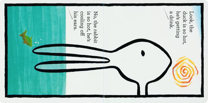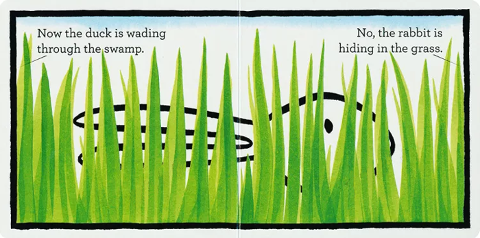 近似正方形的小小绘本,可爱不失精致。粗线条的边框让每一页就好像一副副让人浮想联翩的绘画作品。绿油油的水草(或是草丛?)里,一个鸭子正在蹚水路过一个沼泽地...“不,这是一个兔子偷偷地藏在绿草丛里。”那你觉得呢?