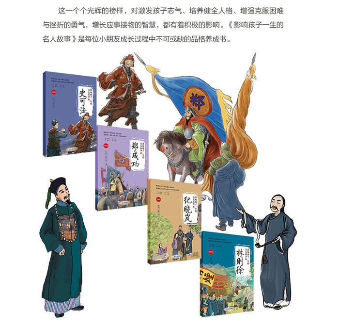 帮助孩子树立远大志向 《影响孩子一生的名人故事》所选人物均为中小学课本中出现的人物,这些耳熟能详的人物传记,对激发孩子的志气,培养健康的人格,增强克服困难与挫折的勇气,增长应事接物的智慧,都有一定的借鉴和启迪作用。 找到人生榜样,获得精神力量 名人是一个光辉的榜样,人物传记是*好的心灵慰藉,能带给我们无穷的精神力量。孔子弟子三千,有教无类;玄奘传佛法跋山涉水,不辞劳苦。阅读名人传记,能使小朋友们找到人生榜样和学习典范。见贤思齐,奋发自强,许多人就是通过学习他们而走向成功的。 通古晓今,获得人生启迪 经典是古人留给我们的言教,名人故事就是留给我们的身教。《影响孩子一生的名人故事》中不仅有人物的生平介绍,也有相关的知识补充。带领小朋友通古晓今,体会不同角色的人生经历,学习他们的人生经验和智慧。
