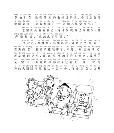 说时迟,那时快,小猪再看,老猪已然穿着一套黑西装,打着条花领带了。不过,乘客的目光还是射向这里,目光里增加了许多惊诧。最糟的是,空中小姐鹿姑娘停在了过道上,用一双诧异的大眼睛打量着这一老一少。飞机上怎么突然多出了这样两位?而且那位肥胖至极的先生,明明衣衫褴褛,怎么忽然间又西装革履,穿得这样漂亮了?