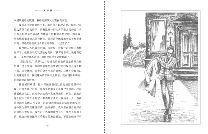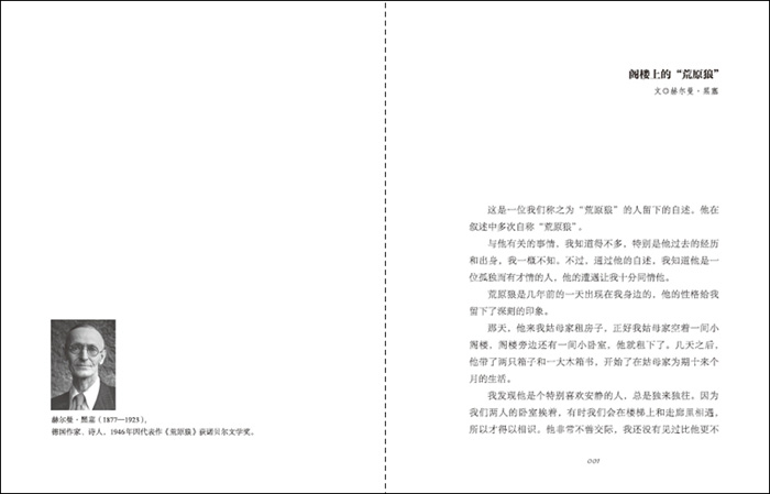 故事的开头充满神秘色彩,作者以自序的方式交代了姑妈家的新房客——一位自称“荒原狼”的中年男子,他与整座城市格格不入,每天闭门不出,但是又透露出高贵的学者气质。后来,“荒原狼”消失在城市中,就像从来没有出现过一样。