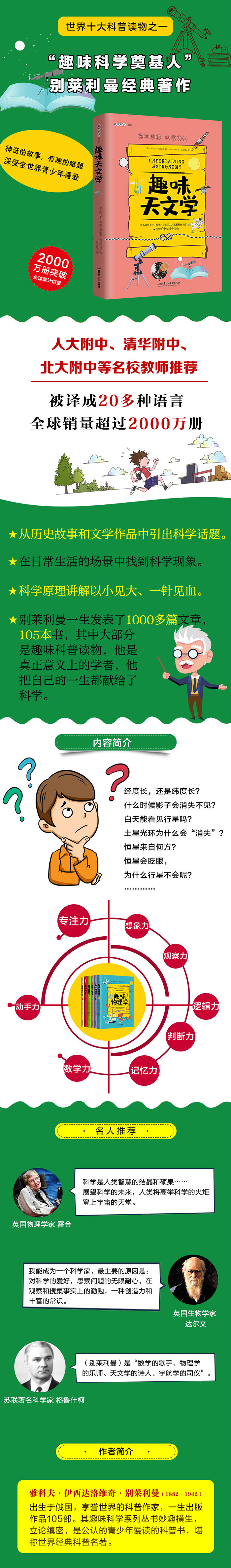 《趣味天文学》:本书介绍了天文学中的一些基本内容和基本现象,而对于我们日常生活常见的许多半懂不懂的天文现象用另一种与众不同的而方式阐述了出来。与此同时,书中也并没有回避那些基本的计算过程,并尽量用简单的中学数学的计算来证明这些问题,帮助青少年们轻松地迈进天文学的大门。