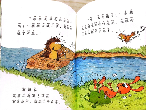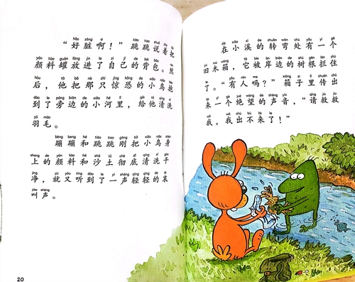 蹦蹦和跳跳放在门口的垃圾不见了。他们沿着地上的轮胎印,发现了一只被随意丢弃的颜料粘住翅膀的小鸟,遇到了一只被困在就木箱子里的刺猬,跳跳的脚还被散落 的玻璃片扎破了。原来他们的垃圾都被河狸施塔布克随意扔在了森林里,施塔布克为什么要这么做呢?