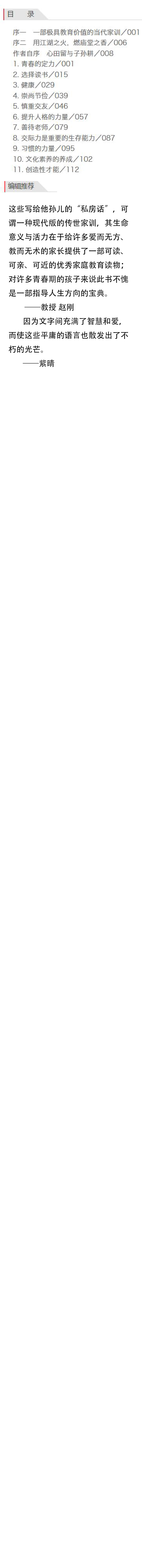 本书是《心田留与子孙耕:爷爷给孙儿的私房话》一书的再版。是作者写给孙子的家训,意欲把优秀的传统文化、自己的人生经验传授给孙子,使他少走弯路,做一个有修养且有益于社会的人。书中引经据典,谈论了人生的方方面面,亲切朴实。本书对于青少年来说,是指引人生方向的参考书;对于许多爱而无方的家长来说,是接地气的教育读物。