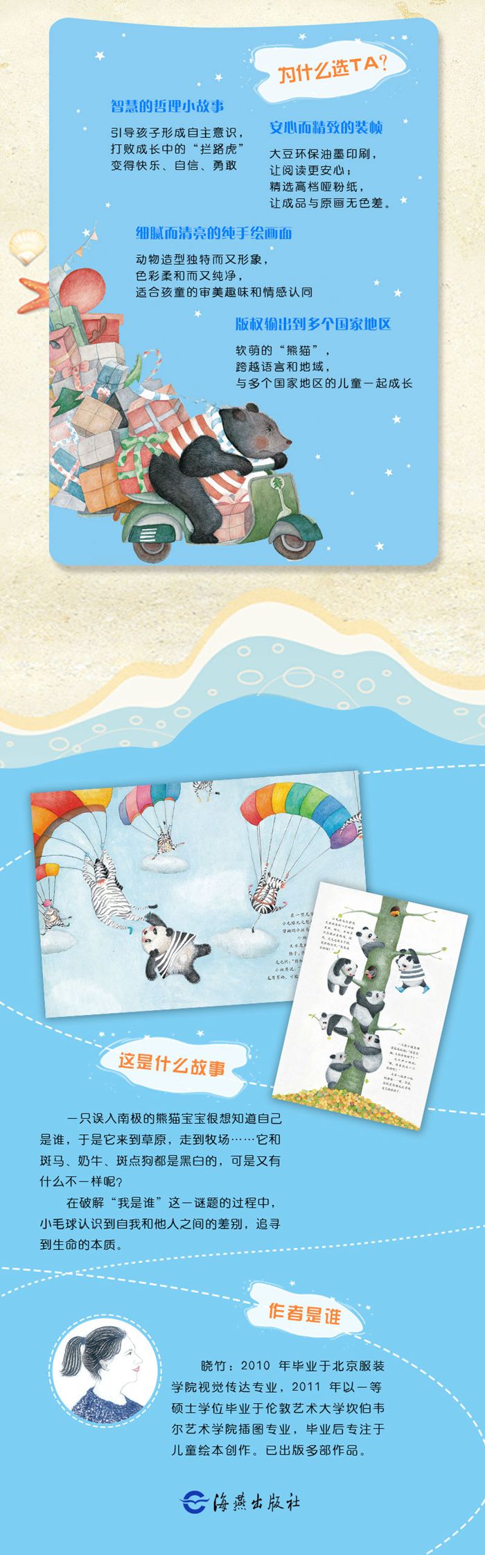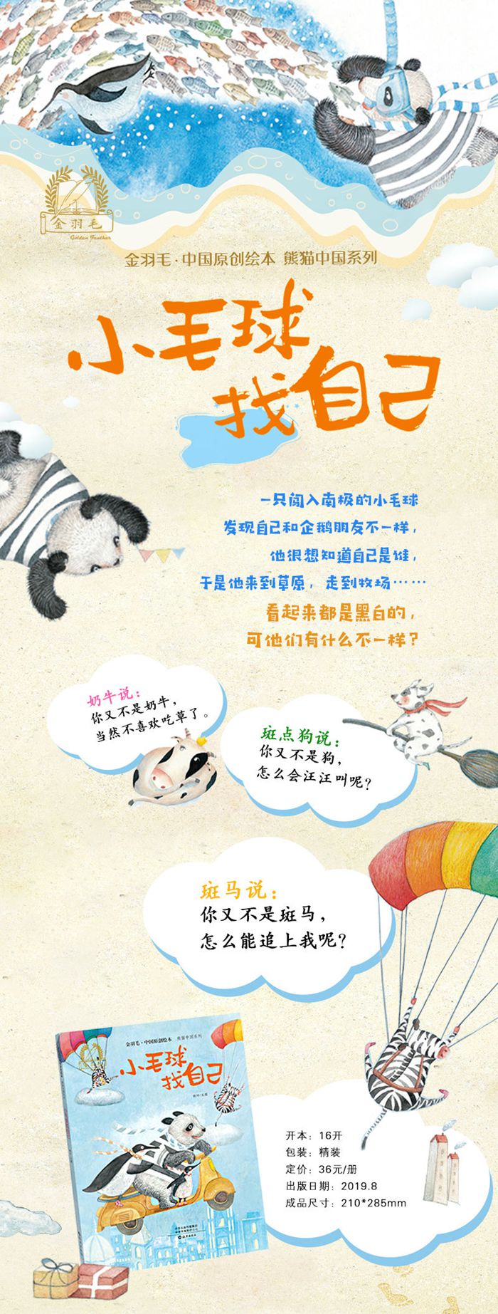 一只误入南极的熊猫宝宝很想知道自己是谁,于是它来到草原,走到牧场……它和斑马、奶牛、斑点狗都是黑白的,可是又有什么不一样呢