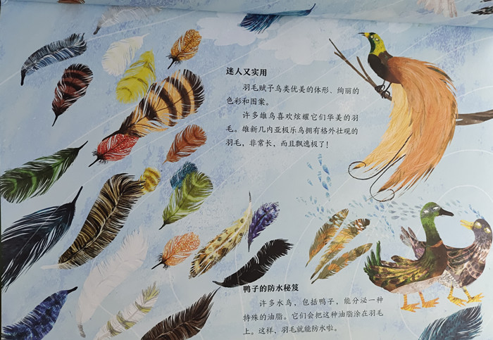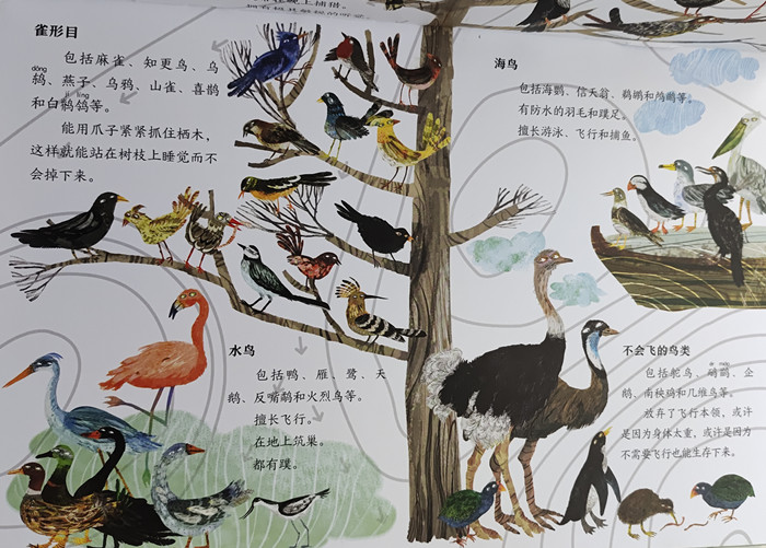 水彩画的插图欢快地散布在书页上,描绘出各种各样的鸟类,它们忙碌地生活在这个世界上……这是一本需要反复阅读的书。在慢慢地、仔细地阅读中,每次都会有新的发现。