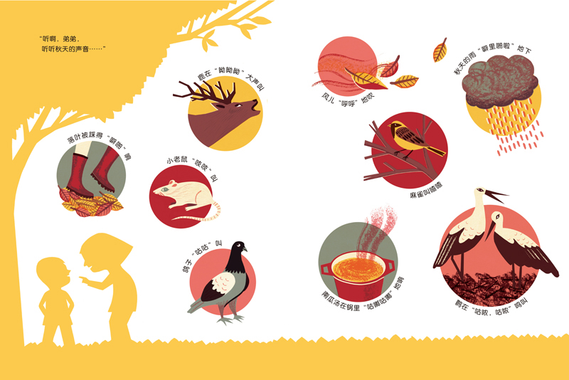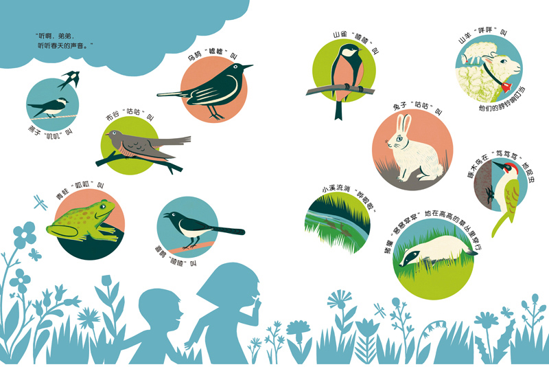 一年四个季节里,各种各样不同的小动物都发出不同的叫声,混合着风声、树叶莎莎声、石头咕噜声……大自然鸣奏出一曲无比美妙的协奏曲。