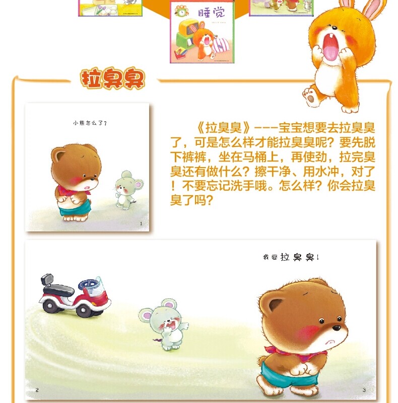 宝宝想要去拉臭臭了,可是怎么样才能拉臭臭呢?要先脱下裤裤,坐在马桶上,再使劲,拉完臭臭还有做什么?擦干净、用水冲,对了!不要忘 记洗手哦。怎么样?你会拉臭臭了吗?