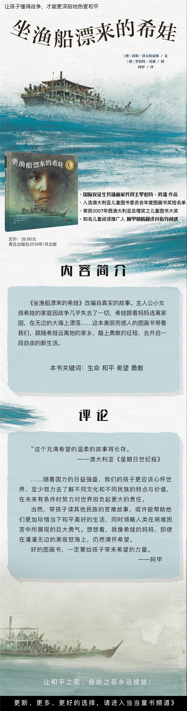 《坐渔船漂来的希娃》改编自真实的故事。主人公小女孩希娃的家庭因战争几乎失去了一切,希娃跟着妈妈逃离家园,在无边的大海上漂荡……这本美丽而感人的图画书带着我们,跟随希娃远离她的家乡,踏上勇敢的征程,去开启一段自由的新生活。