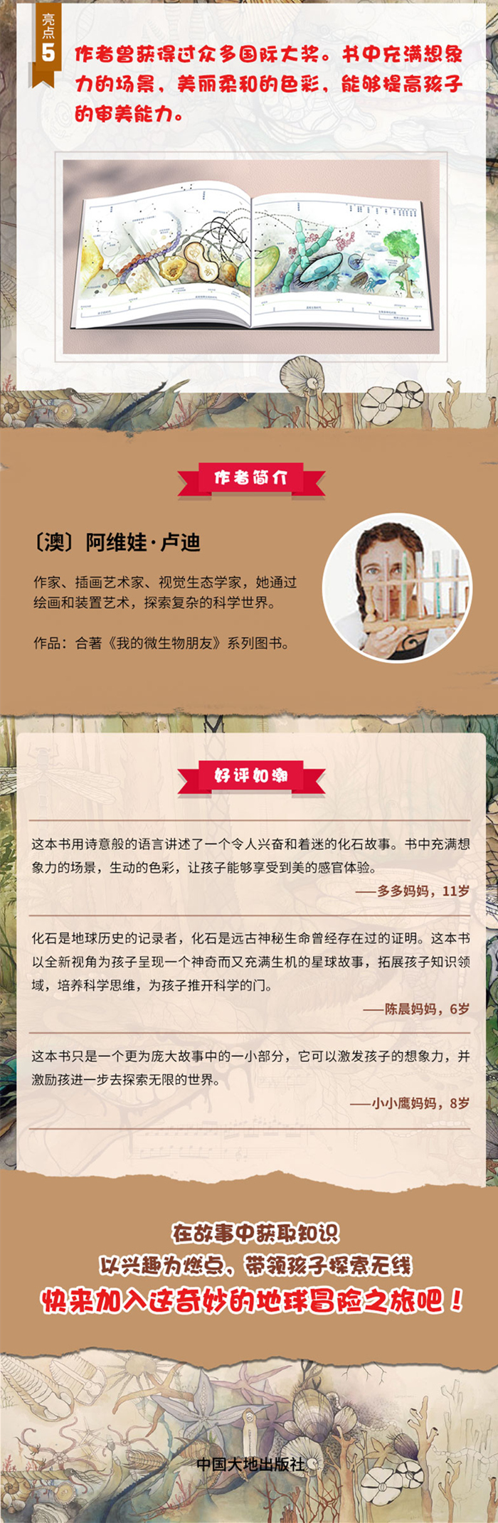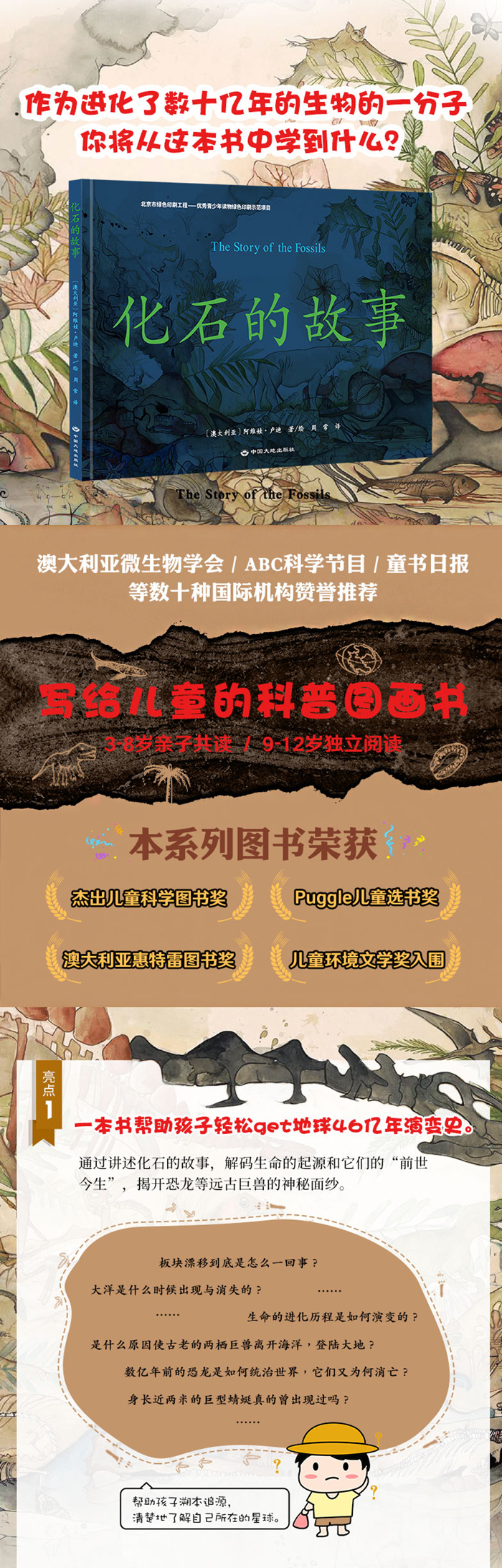 这本书用诗意般的语言讲述了一个令人兴奋和着迷的化石故事。书中充满想象力的场景,生动的色彩,让孩子能够享受到美的感官体验。 ——多多妈妈,11岁 化石是地球历史的记录者,化石是远古神秘生命曾经存在过的证明。这本书以全新视角为孩子呈现一个神奇而又充满生机的星球故事,拓展孩子知识领域,培养科学思维,为孩子推开科学的门。 ——陈晨妈妈,6岁 这本书只是一个更为庞大故事中的一小部分,它可以激发孩子的想象力,并激励孩进一步去探索无限的世界。 ——小小鹰妈妈,8岁