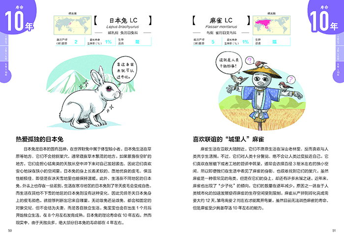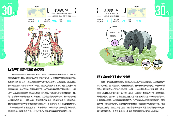 这是一本让人惊叹不已的动物寿命书,书中精选了63种动物,按照寿命由长到短的顺序将这些动物呈现给读者,其中既有寿命长达200年之久的亚达伯拉象龟,也有短暂不到100 天的蜜蜂、柑橘凤蝶等。 不仅如此,书中还为大家揭秘了动物的长寿秘诀,宽吻海豚会在石头上“搓澡”,河马喜欢夜游,大熊猫在山中独享美味的竹子...... 这本书在介绍不同动物寿命长短和成长方式的过程中,通过搞笑幽默的文字和拟人化的趣味动物插图,淡化了死亡这个话题的沉重感,将动物不为人知却极为有趣的一面展现的淋漓尽致,让孩子在轻松愉快的阅读中了解不同动物的生命过程,领悟生命的意义。