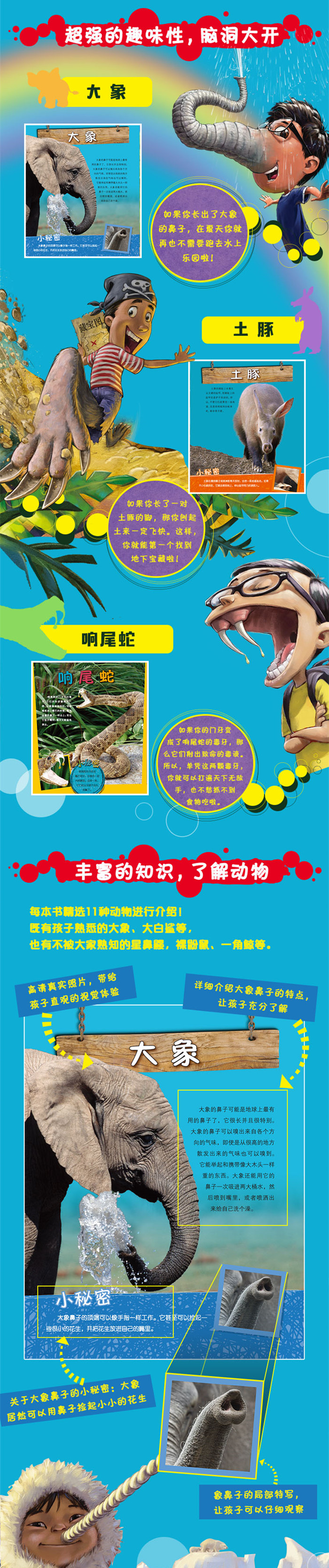 ★画风夸张、夺人眼球,同时也不失美感,全书图片都极具吸引力。 ★让孩子在充满想象力的旅途中探索自己的牙齿、鼻子、耳朵、脚或头发被动物的身体所取代的样子。带入感极强。 ★每本书会介绍11种动物的特点,读者通过想象自己身体被替代后会发生的事儿,从而加深对动物的了解。