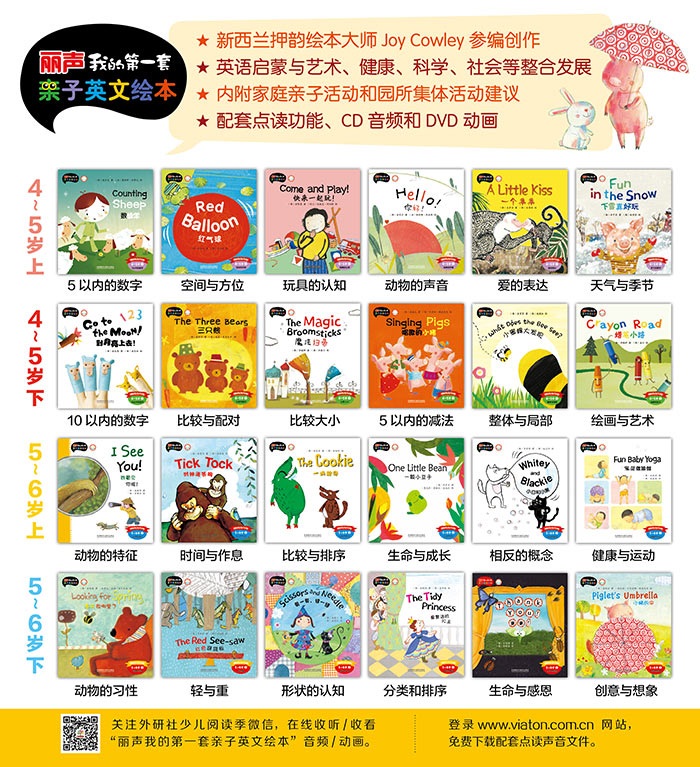 关注外研少儿阅读季微信 ,在线收听/收看“丽声我的第一套亲子英文绘本”故事书音频和视频。