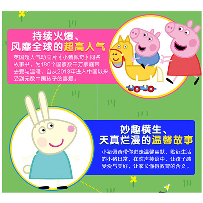 本套书是小猪佩奇动画故事书系列第三辑,是英国有名动画片《小猪佩奇》的同名动画故事书,讲述了小猪佩奇的故事。小猪佩奇是一只很好可爱的小粉红猪,她与爸爸、妈妈以及弟弟乔治快乐地住在一起。佩奇很喜欢做的事情是玩游戏、打扮得漂漂亮亮的、度假,以及在小泥坑里快乐地跳上跳下。除了这些,她还喜欢到处探险,虽然有些时候会遇到一些小状况,但总可以化险为夷,而且都会带给大家意外的惊喜。