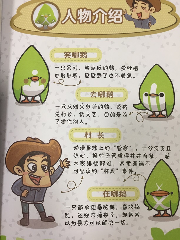 王浩之主编、尹戈绘画的《村长趣哪鹅》讲述:动漫星球上,村长是一个十分负责且热心的好人,他将村子管理的井井有条,替大家排忧解难,却也常常有着不可思议的“倒霉杯具”事件,令人捧腹不止。外星生物哪鹅们跟着村长处理各种小事,却因单纯呆萌的个性闹出不少笑话,有时还会说出许多雷人话语让村长无可奈何,为简单的生活增添了无限的欢乐。村长和哪鹅们虽然生活在远离地球的外星,却也和地球上的小朋友一样吃饭、学习、睡觉、玩耍,他们的囧经历、神吐槽以及充满活力和爆笑的日常,一定能让小朋友们看得开心不已。