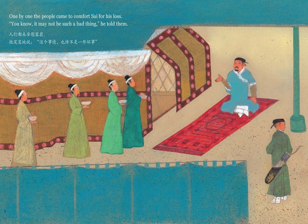 杨志成先生的每本图画书都有独特的艺术风格,这本《塞翁失马》的绘画是以中国传统的工笔写意笔触,细腻地呈现了古时特有的风土人情和故事人物的喜努哀乐。用简洁质朴的语言为孩子们讲述中国人在“得到”与“失去”时表现出来的智慧,启发孩子超越时间和空间去观察事物,辨证地看待问题,而不是只注重眼前的得失。
