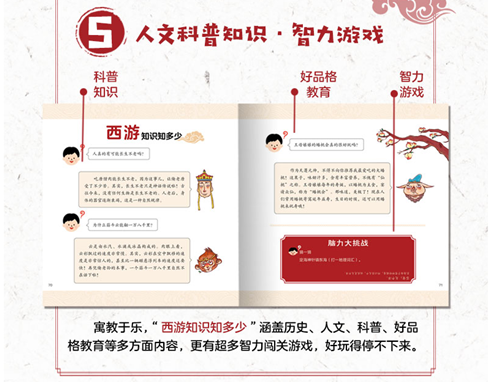 一个人在10岁时看《西游记》和在30岁时看《西游记》,效果*不一样。因为推理力越薄弱的人,越容易激发想像力,这也是为什么小孩子信《西游记》的原因。从小读西游,不仅能培养孩子从小阅读古典文学的习惯,更能激发孩子无穷的想象力,领悟和学习为人处事的道理。