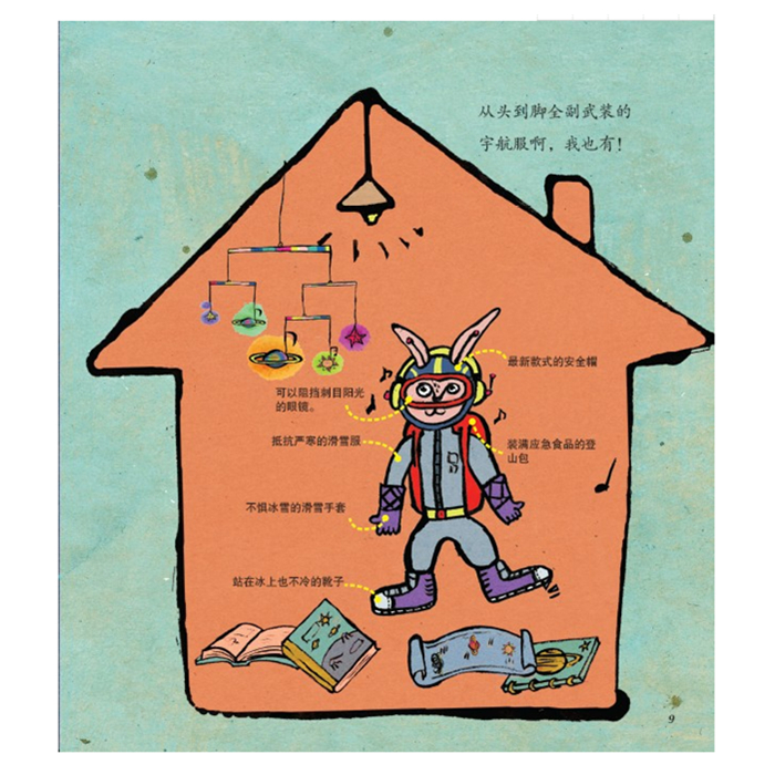 《旅行童话集·GOGO世界旅行:想当宇航员的兔子》中的每张插图都会说话,图与图之间呈现独特的叙事关系,儿童得以由直觉进入绘本的世界,自然流畅地听故事。由于小朋友识字不多,不能独立阅读,所以绘本的文字,便须要大人代为关读,再说给小朋友听。也就是说,绘本的文字并不是写给小朋友看的,而是让他们听的。