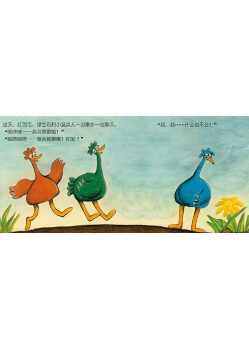 红羽毛会唱歌,绿宝石会跳舞。小蓝点儿却什么也不会。但是小蓝点儿会跑步,而且跑得特别的快,猎豹都跑不羸它。因为小蓝点儿是只鸵鸟。