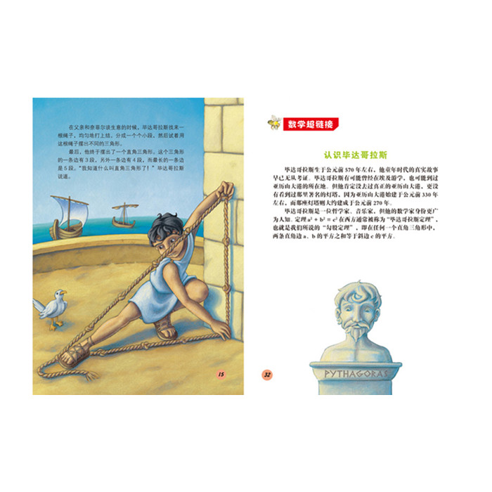 《乐队拯救者》(知识点:比例的运用):很久很久以前,古希腊有个小男孩叫毕达哥拉斯,他遇到什么事都会动脑思考,通过实验和推理找到其中的规律。音乐节快要到了,毕达哥拉斯通过改变管子乐器的长度比例、在竖琴上按重量比例拴上不同的小石头,让大家演奏出来的乐曲特别悦耳。看来,数学比例和美妙的音乐还有密切关系哦!