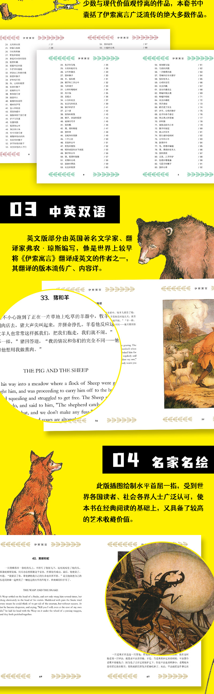 《伊索寓言》是世界上最早的寓言童话集之一,是古希腊文学的重要组成部分,本次推出的《伊索寓言》是中英双语彩图名绘版本,英文部分由英国著名文学家、翻译家弗农·琼斯编写,此版插图部分为美国米罗·温特尔的手绘插图,水平受到各国读者的广泛认可。
