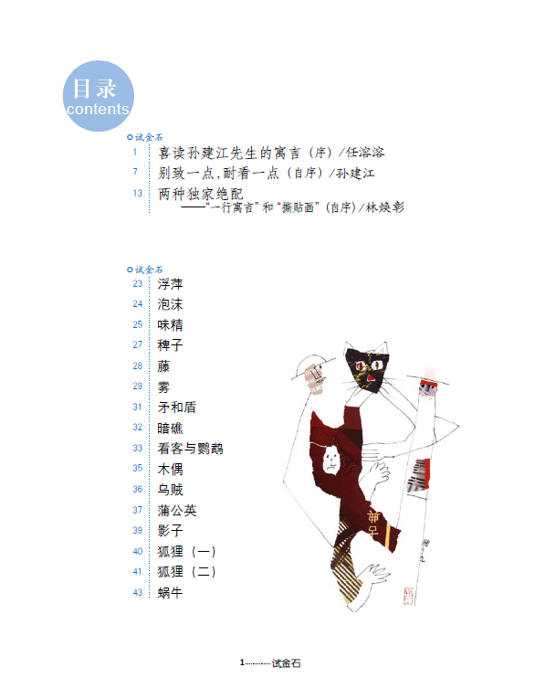 本书颠覆了传统的寓言创作模式,推出了与普通寓言截然不同的寓言作品《试金石》。作品格式独特:题目——一样东西;正文——题目所指那东西说的话。结构简单,言简意赅。作者充分利用不同物的各自特点,以幽默机智的言语道出其中的寓意,这些寓意或讽刺,或引人发笑,或引人深思,回味无穷。例如《狐狸》一文,正文是狐狸说的话:“不是我狡猾,而是别人笨。”以狐狸的视角道出一种看事物的逻辑关系,以诙谐的笔调证明一个道理,这种效果甚至比通过故事来讲的效果还更直接有效,读来非常耐人寻味。本书特别邀请了台湾著名诗人,作家,画家林焕彰先生为其配画,林焕彰先生采用极其独特的撕纸画为作品配画,每幅插画绘制都非常精美,极富艺术性、观赏性,为本书增添不少色彩。可以说本作品的插画与文本相得益彰,使得这部作品更趋完美。