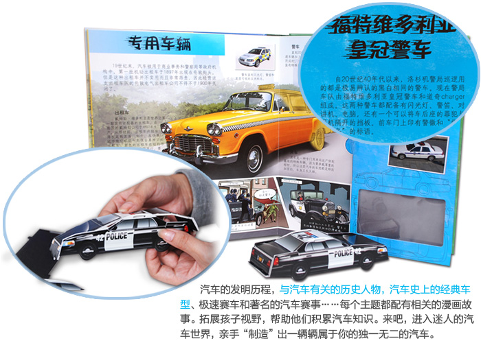 汽车的发明历程、与汽车有关的历史人物、汽车史上的经典车型、极速赛车和著名的汽车赛事……每个主题都配有相关的逸闻趣事漫画。在拓展视野的同时,小读者还可以用书中所附的模型组件组装出5款立体汽车模型──福特T型车、F1赛车、兰博基尼蝙蝠跑车……每一款都是那么酷,那么炫!快来进入迷人的汽车世界吧!