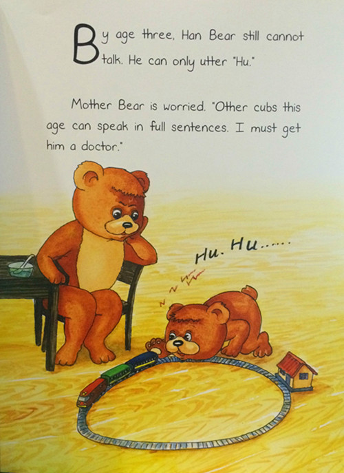 By age three, Han Bear still cannot talk. He can only utter “Hu.” Mother Bear is worried. “I must get him a doctor.” Mother leaves the house and tells Han Bear: “Remember, no matter who comes, don’t open the door.” Guess who comes to the door?