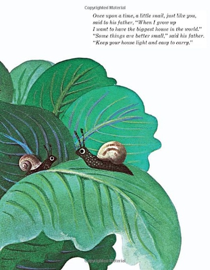 A young snail dreams of having the biggest house—or shell—in the world. Then one day, his wise father tells him the story of another snail with the same dream. He grew and grew, adding bright colors and beautiful designs, until he found that his house came at a terrible cost. The young snail decides that a small, easy-to-carry shell might be best for a life of adventure and exploration.