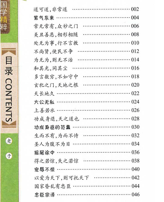 精选国学名著《老子》中适合诵读和记忆的经典语段,如:道,可道,非常道、有无相生,难易相成,长短相形,高下相盈,音声相和,前后相随,恒也,加注拼音,给以简洁注释,并译出原文大意。为帮助学生理解原文,本书还配绘了大量精美插图。 主题词:道家-老子-少儿读物