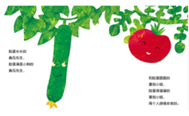 《咕噜咕噜》描绘了一个简单而可爱的故事:一个菜篮子打翻了,青椒、苹果、南瓜……蔬菜咕噜咕噜从山坡上滚下去,掉进了河马的大嘴里。另外两本《美味猜一猜》《蔬菜大家族》也是通过数字游戏、猜谜游戏等趣味方式来增进幼儿对绿色食品的好感度。