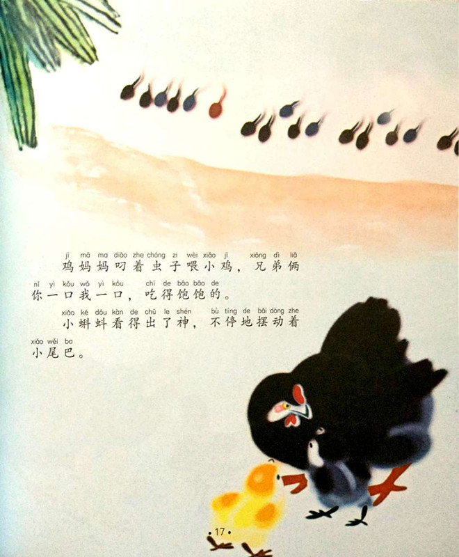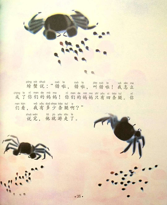 小蝌蚪们要去找妈妈了,他们拂过柔柔的水草,挤过窄窄的石缝,找到了金鱼、螃蟹、乌龟、鲇鱼,可都不是他们的蚂妈。哦,原来大眼镜、白肚皮、不多不少四条腿的青蛙才是他们的妈妈。