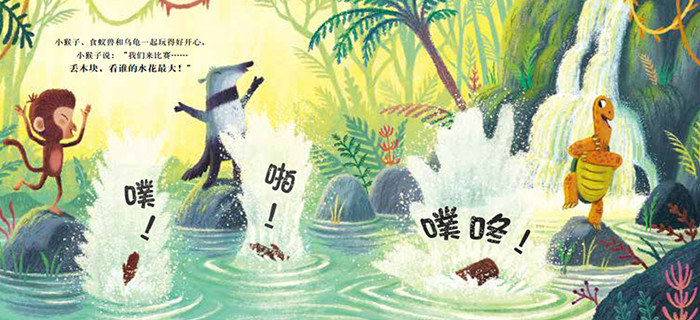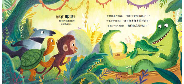 在游戏里挥洒童趣、学会尊重 吴幸玲(台湾辅仁大学儿童与家庭学系兼任副教授) 故事蕴藏游戏互动和声音趣味 三个好朋友——小猴子、食蚁兽和乌龟,一起玩得好开心。他们比赛丢木块,看谁的水花*;他们学怪兽、跳搞笑舞,也玩起声音的游戏。丢木块到水里时,会出现“噗!啪!噗咚!”水花溅起的声音。一起学怪兽时,他们自然发出“嘎——哇——呀”的吼叫声。大跳搞笑舞时,还伴随着“啊布滴!哈布滴!”的节奏声音。在与孩子反复读时,小小孩对角色间的游戏和声音变化特别感兴趣,他们会大笑着,也跟着模仿角色发出不同声音! 故事文本表现角色的情绪转变 三位好友在面对鳄鱼母子时,看着他们好尖的爪子、好多的牙齿,自然而然地轻声对话,心里是有些胆怯。待大鳄鱼妈妈邀请他们一起玩“亲鳄鱼”游戏,又忍不住想玩,勇敢地亲了一下小鳄鱼。其中,小猴子曾临阵退缩,在同伴们的激励之下,鼓起勇气亲下去,没料到小鳄鱼突然醒来还追着他跑…… 小小孩的心情,也会随着故事角色的处境而起伏,时而勇敢、时而担忧,自然投入故事的发展步调,直到小鳄鱼明白表达想加入友伴的游戏,孩子们终于松了一口气。 图像突显角色的生动表情和姿态 小鳄鱼的表情变化颇有戏感,一开始他闭着眼睛装睡,享受友伴的亲亲;忍不住半眯着眼;之后突然张开眼睛吓小猴子…… 在翻页之间,小小孩会指着图,发掘角色微妙的表情变化和肢体动作,看图说话,甚是有趣! 头次读这本书,翻到“鳄鱼”这一页时,心中不免一惊,很好奇结局会是什么。过程中,看到小猴子亲鳄鱼的表情时,心中不觉莞尔,因为这就是幼儿园里,孩子们合作游戏时会出现的情景。孩子们合作游戏的过程中,常常发明天马行空的方法,彼此间也需要学习与不同特质的友伴相处与如何表达商量,就跟书本里的动物朋友们一样! ——台湾信谊实验幼儿园园长 陈泽佩 看似无厘头的溅水花、学怪兽叫和跳搞笑舞却能带来无比的欢乐,这就是儿童游戏迷人之处。当成人愿意给出空间,孩子自然能创造玩法,并且在游戏中建立规则与界限。故事里的小动物们游戏,不需绚丽玩具,没有电动3C,像是“亲鳄鱼”这类带有冒险性的刺激游戏*受欢迎,如同过去我们玩“炒萝卜”或“红绿灯”,只要启动创意想象,就能自由地跑跳,自在地与人互动,能力逐渐在玩耍中长成。 ——台湾图画书阅读推广人 卢怡方 这本书让孩子理解不能单单以外表评断一个人。有的人虽然看似难以接近,内心是非常友善的哦!很适合3到4岁的孩子阅读,因为他们正经历初步认识“友情”的阶段。 ——Whispering Stories Book Blog网站 图片的笔触很像孩子常使用的蜡笔和彩色铅笔,又能细致地画出故事深度,尤其是亲小鳄鱼时放大的画面增添了阅读的趣味性,这本书好适合说故事活动! ——英国亚马逊读者 Lilyfae 完全可以想象孩子们模仿书中动物们滑稽动作然后哈哈大笑的样子! ——英国亚马逊读者Serenity