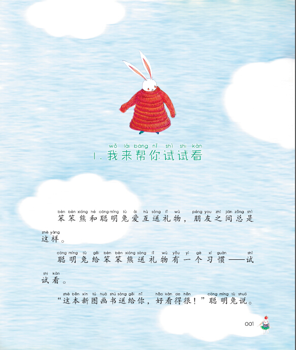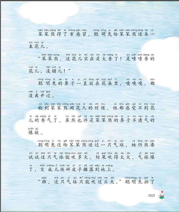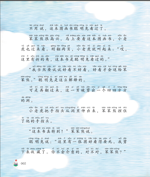 笨笨熊和聪明兔是一对好伙伴儿,他俩总爱互相送礼物。不过,聪明兔有一个坏习惯,她送笨笨熊礼物时,总喜欢试一试——新书她先看看,鲜花她先闻闻,气球她先吹吹……这天,笨笨熊为聪明兔准备了一份礼物。在小老虎的提醒下,笨笨熊也试了试。这回,聪明兔可傻眼啦!