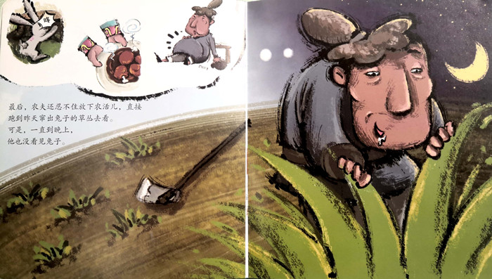 农夫本来安心地在田里劳动。可是有一天,一只兔子撞死在树桩上,让他白白捡回家大吃了一顿。从此以后,农夫天天等撞死的兔子,农活儿也不做,最后,田地都荒废了。
