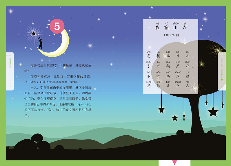 升级版每册分上、下两篇,每篇包含三辑,依据所选经典古诗文的主题进行分类,内容涉及风景名胜、节气民俗、品格修养、神话传说、咏史怀古等诸多方面。体例方面,在所选古诗文经典原文之后,增加了详尽的注释和优美流畅的译文;另有“阅读链接”和“体验运用”两个环节,为小读者提供了与所学古诗文紧密相关的、丰富多彩的阅读资料和实践指导。