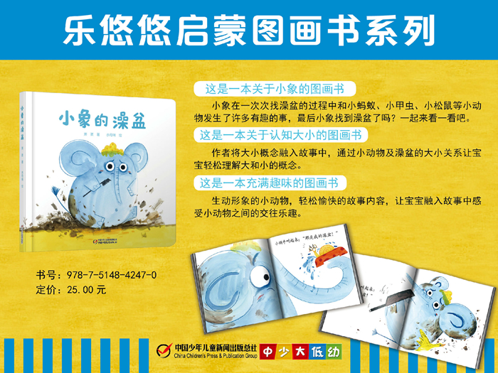 这是一本认知大小的启蒙图画书。小象找澡盆,找到一个小澡盆,原来是小蚂蚁的澡盆;他又找啊找,找到一个小澡盆,原来是小甲虫的澡盆……小象找呀找,找不到属于他的澡盆,这可怎么办呢?在轻松欢乐的节奏中,让宝宝理解大和小的概念,并认识不同大小的动物。