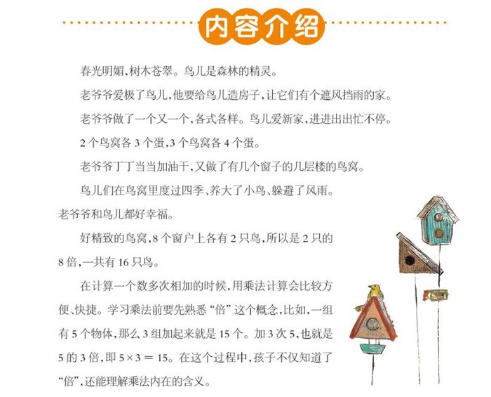 在计算一个数多次相加的时候,用乘法计算会比较方便、快捷。学习乘法前要先熟悉“倍”这个概念,比如,一组有5个物体,那么3组加起来就是15个。加3次5,也就是5的3倍,即5×3=15。在这个过程中,孩子不仅知道了“倍”,还能理解乘法内在的含义。
