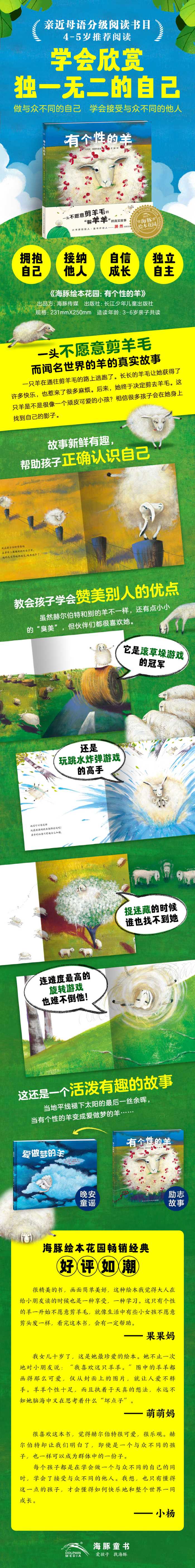 一只羊在通往剪羊毛小屋子的路上逃跑了。由于毛长,她成了捉迷藏高手、滚草垛高手;过生日时,她可以在身上扎满漂亮的蝴蝶结。这只羊身上的毛越来越长了,当其他羊快乐地玩耍时,她却不得不安静地躺在草地上休息,最后,她终于决定去剪羊毛。在寒冷的冬天,所有剪过羊毛的羊都系上了用赫尔伯特的毛做成的漂亮围巾遮蔽寒冷。该绘本传递了即便是一个与众不同的孩子,也一样可以成为群体中的一分子的内涵意义,每个孩子都是在学会做一个与众不同的自己的同时,学会了接受与众不同的他人。