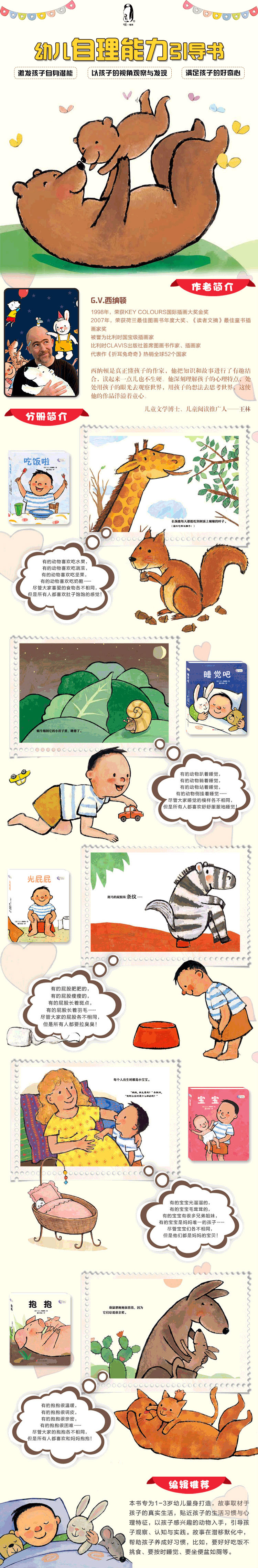 这本书讲述了不同动物的睡觉姿态,适合0-3岁幼儿阅读。有的动物在趴着睡觉,有的动物站着睡觉,有的动物在洞里睡觉……本书让幼儿了解不同动物的睡觉习性,也引导幼儿好好睡觉。可爱的画风,童趣的内容,配合小巧的开本,让宝宝们在认识自己的同时,了解 多其他相关的生活常识,养成健康的生活习惯。